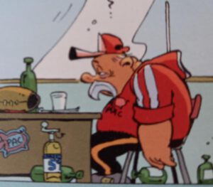“KIP”, rommelt Rocco content, en laat zich zakken op een met gewapend beton verstevigde tractorband, die als rustplaats voor Rocco’s olifanteske fysiek in het bouwval clubhuisis geplaats, na een voorgeschiedenis van 13 geplette stoelen, vier vermorzelde tafels, een dode wasbeer en een piano waaruit het fiere clublied van RC De Bøk Erin nimmer meer zal klinken.